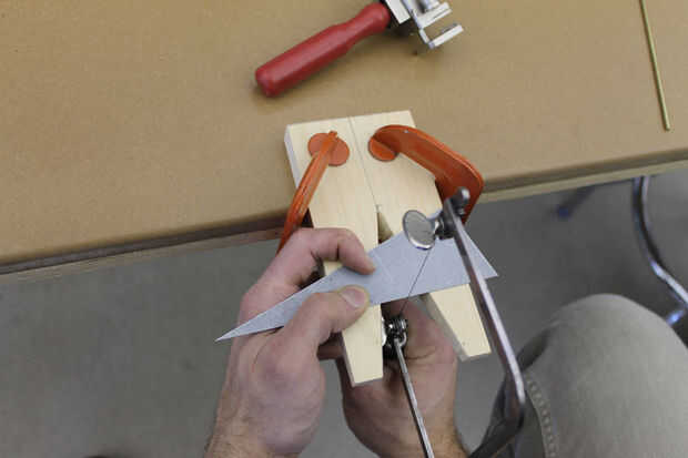 Presentar un canal a través de un dedo para sostener un pedazo de varilla que está lijado.