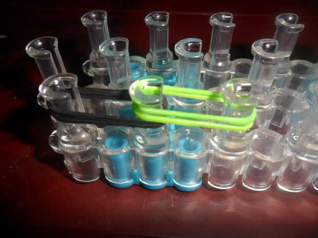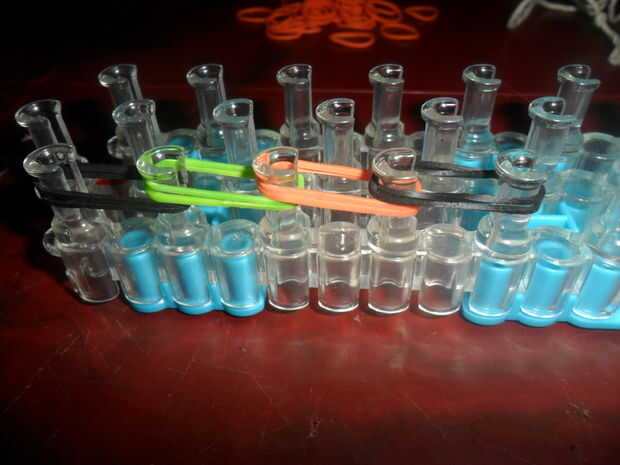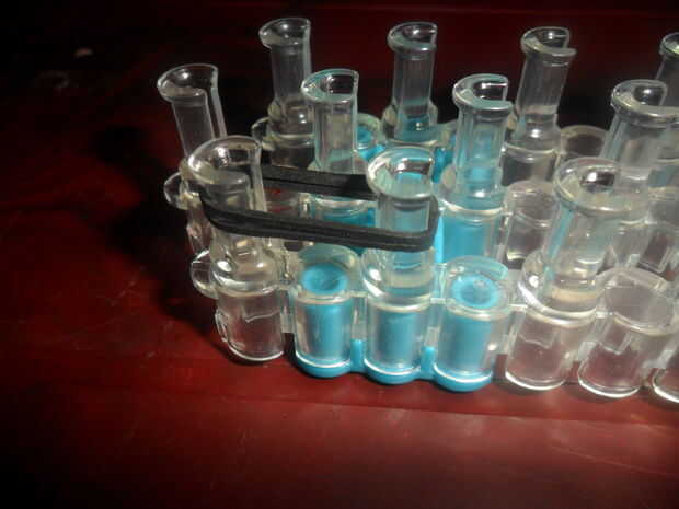 Comience poniendo dos bandas sobre las dos clavijas del telar y repita el procedimiento en todas las fichas restantes. En las últimas dos clavijas, puesto en 4 bandas en lugar de 2.