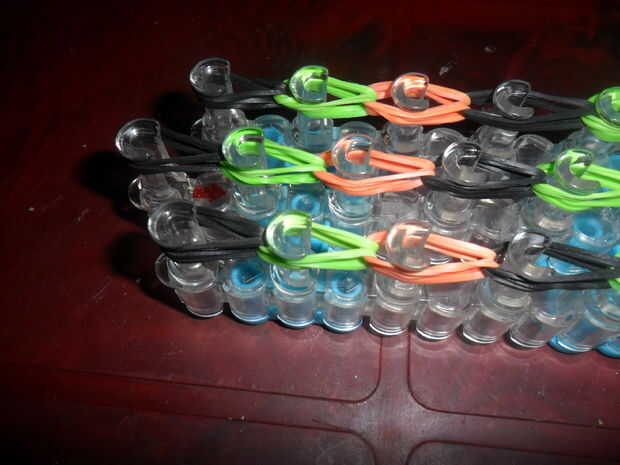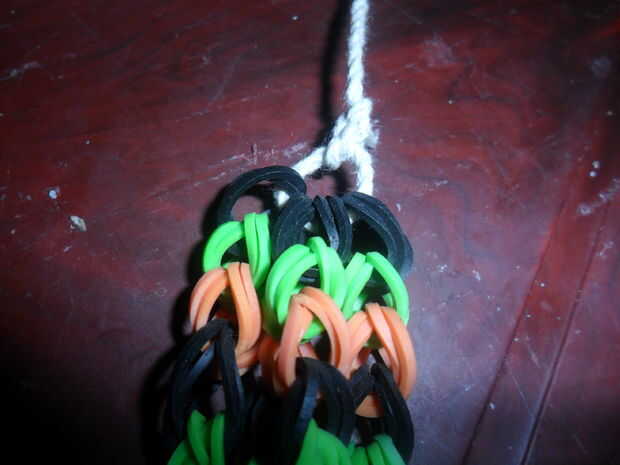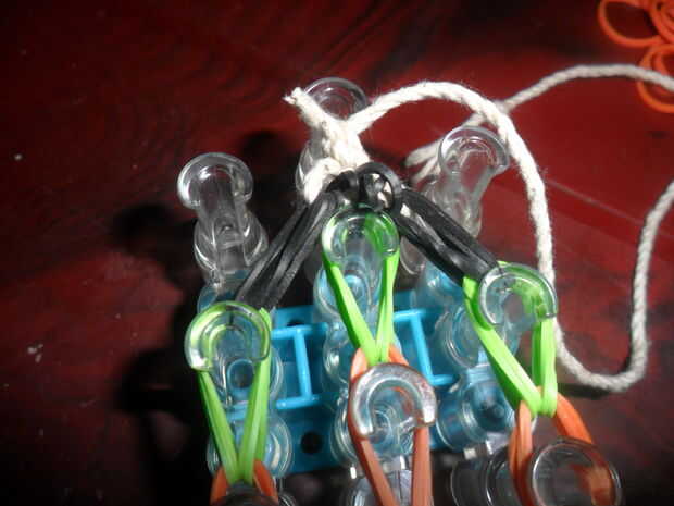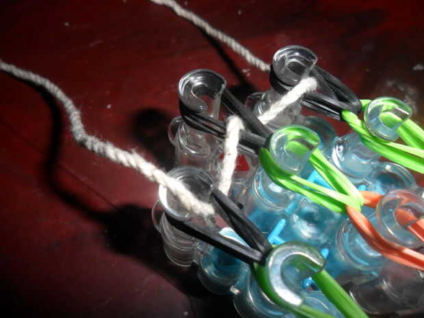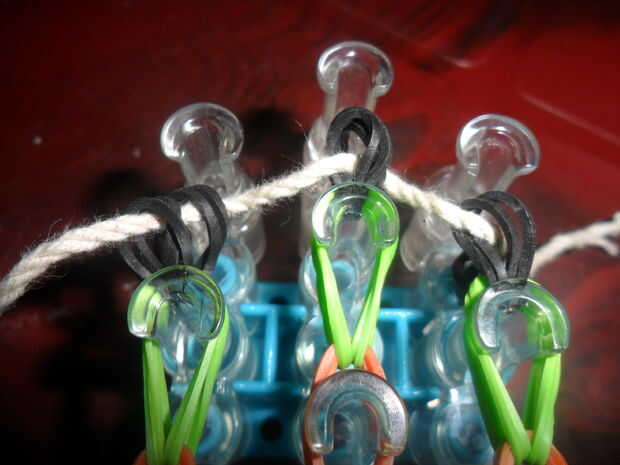 Repita los pasos 2 a 4, para hacer otro 2 filas. Pase la cadena o el paracord a través de las bandas que pones en el primero, como se muestra en la foto 2, y luego levantar estas bandas fuera de las clavijas y aprieta y atar la cuerda. Después de eso, atar los otros extremos de las bandas de la misma manera y saque todo el telar.