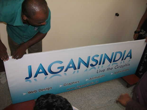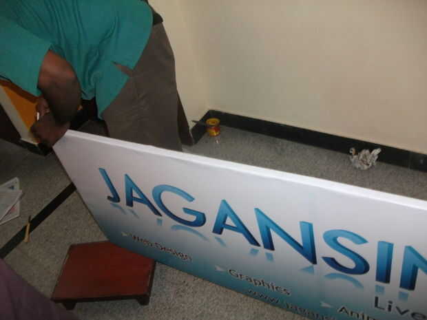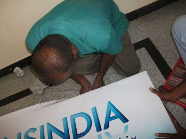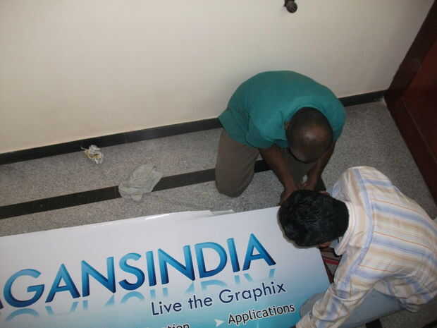 Pegando el banner es la parte más difícil. Uno debe tener en un lado y debe estirar la bandera a otro lado para hacer limpia y líneas de aire libre que se pega de la bandera en el marco del metal