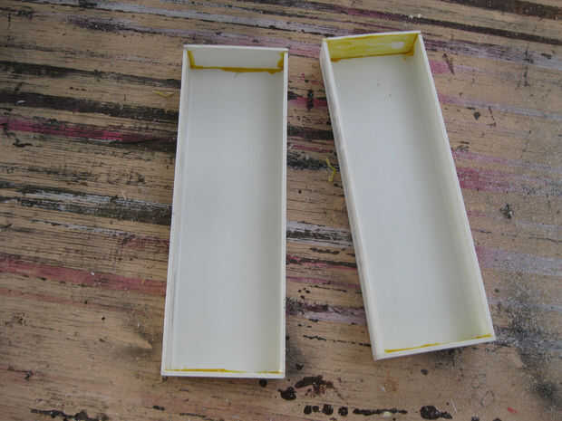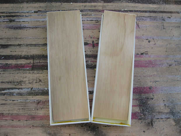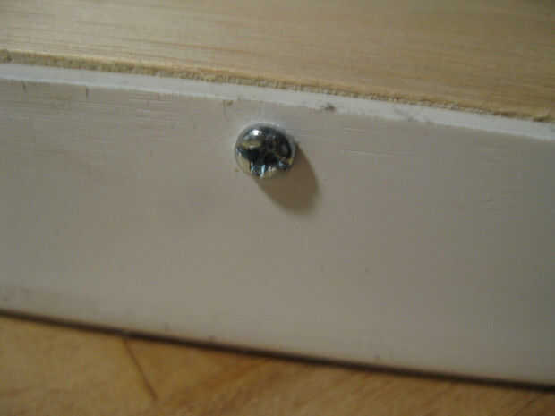 Hice la parte inferior de un trozo de madera contrachapada de 1/4". Corte 3 5/8 "x 11 7/8" por lo que cabe perfectamente en la caja. He marcado un agujero de 2" en cada extremo y perforó un agujero piloto. Usé 4 tornillos pequeños para sostener la parte inferior en la caja. He añadido pequeñas de fieltro a la parte inferior para proteger las superficies.