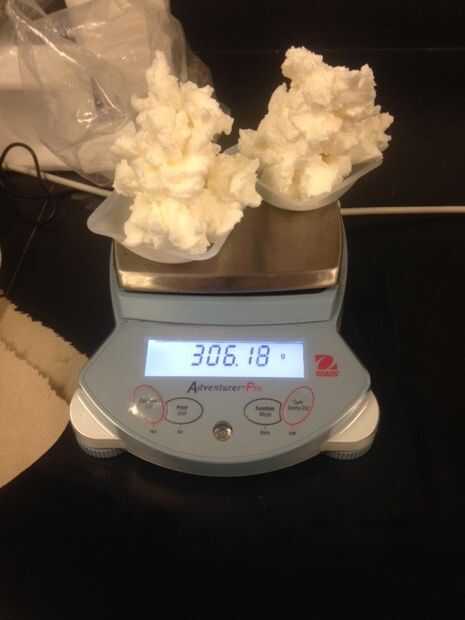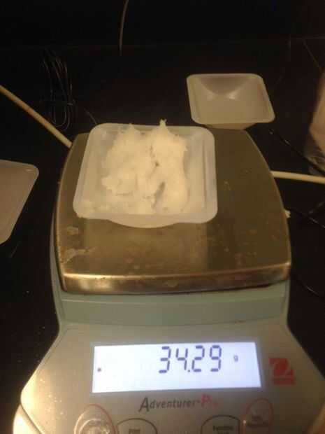 Decidimos usar 70% Walmart GV acortamiento y 30% aceite de coco, pero se debe subir con su propia receta. Se utilizó una calculadora de jabón en línea para calcular cuántos gramos de Walmart GV acortamiento que necesitábamos y cuántos gramos de aceite de coco que necesitábamos. Elegimos un total de 75 libras (340,3 g) para la masa total, por lo que utilizamos 0,225 libras (102,05 g) de aceite de coco y nos.525 libras (238,13 g) de Walmart GV acortamiento. Luego calculamos cuánto hidróxido de sodio utilizando el proceso de cálculo del paso 3. Se utilizaron 116 mL de hidróxido de sodio.