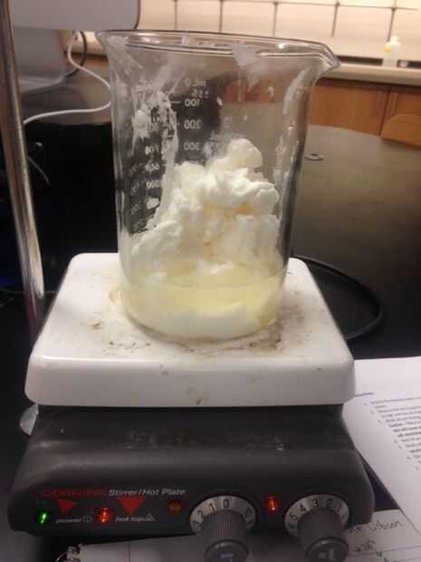 En primer lugar, que coloque sus grasas y aceites en el vaso de precipitados de 1000 mL y fundirlo. Después de se derrite en un líquido, tomar el hidróxido de sodio (su base) agrega a la solución lentamente y mezclar continuamente utilizando la barra de agitación magnética y la varilla de mezclar. Una vez que todo el hidróxido de sodio en la solución de jabón que desea continuamente mezcla hasta es gruesa. Debe ser lo suficientemente espesa para donde se puede dibujar un ocho con la solución usando la varilla de mezclar en la parte superior y debe permanecer allí durante unos segundos.