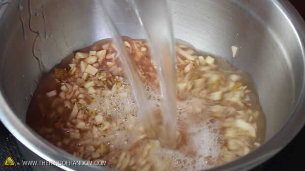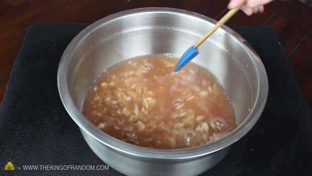 Cuando ya tienes tus papas reducidas a pedacitos pequeños, deslice todo en un tazón grande y vierta suficiente agua caliente para cubrirlos completamente.