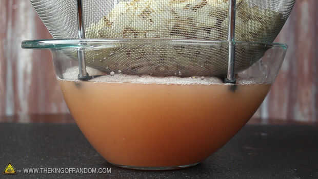 Ahora coge un colador y otro tazón grande, separar el agua de papa los trozos y ver de cerca como algo increíble comienza a suceder.