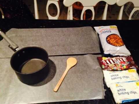 Para esto se necesita una olla horno, papel de cera, utensilio de agitación, M & Ms, pretzels y dos bolsos de blanco chocolate. Usted debe primero conseguir todos!