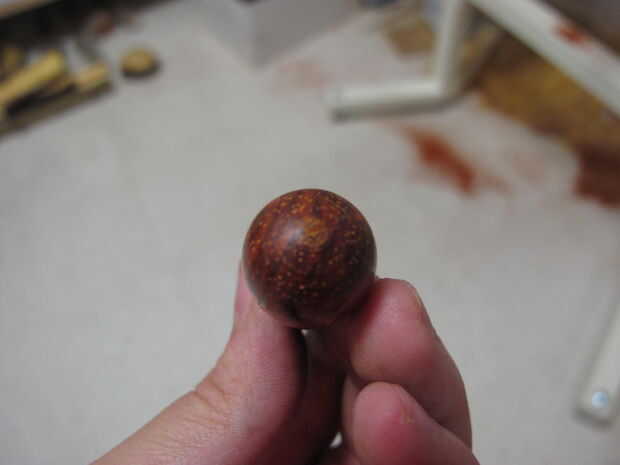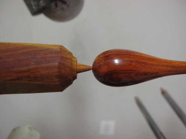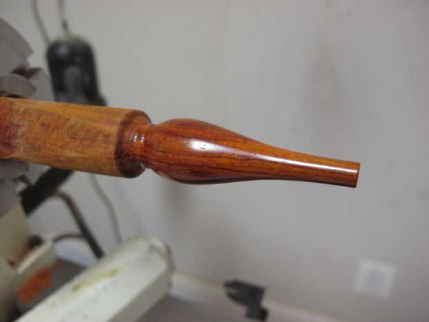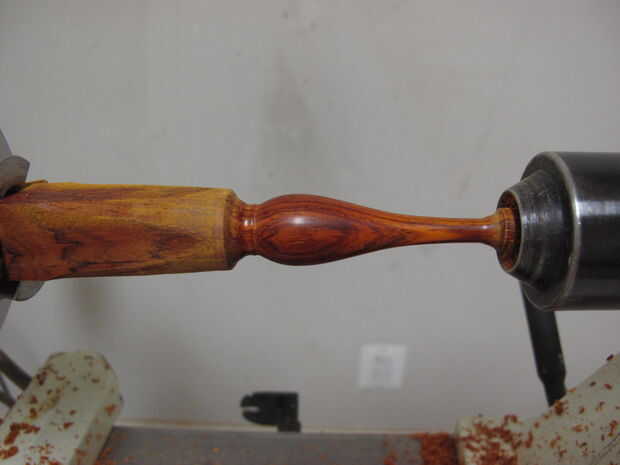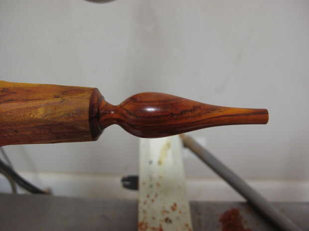 Empezar a formar la manija quieras, teniendo en cuenta que hay un agujero que atraviesa la pieza. Al llegar más cerca y más cerca del diámetro del agujero, comienzo haciendo comprobaciones de tamaño muy frecuentes para asegurarse de que usted no está demasiado cerca. 1/64" a 1/32 es un buen espesor que tienen en la punta de la agarradera.
