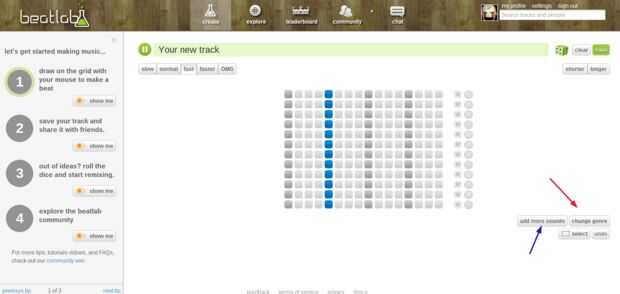 El crear dará lugar a un montón de cosas cuadradas. Cuando haga clic en los cuadrados que se vuelven orange.you puede hacer el gráfico más. Ver la flecha roja señala a la GENRE.when que elegir un género diferente todos los sonidos son diferentes. La flecha azul conduce a seleccionar un sonido. Al llegar recoger un sonido bien que elegir sonidos que quieres que no están en la lista para usted.