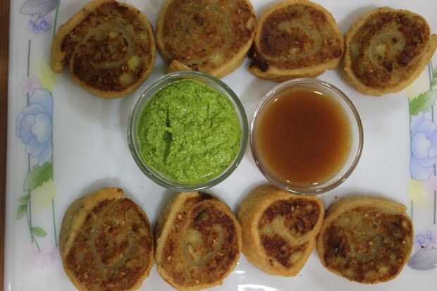 Hurra, lo hicimos. Bhakharwadi deliciosa con el chutney dulce y también con el chutney verde...