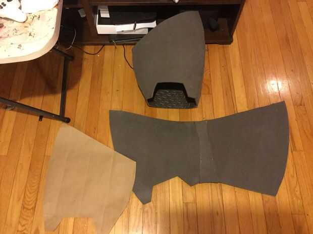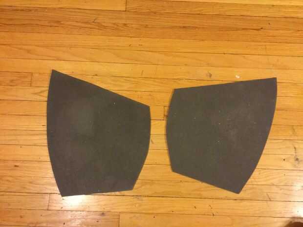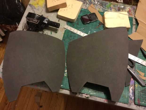 2) Utilice las medidas para cortar un rectángulo en una hoja de papel. Dibujar la imagen un corte hacia fuera. Utilizar la plantilla para cortar el muslo frontal de EVA. (Foto 1)