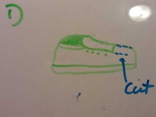 1. tomar sus zapatos y quitar los cordones (guardar cordones para más adelante). es bueno utilizar tapas de baja para estos zapatos. Corte más a lo largo de la lengüeta del zapato, porque tienes que ser capaz de conseguir un taladro hasta la parte del dedo del pie del zapato. (Foto 1)
