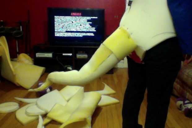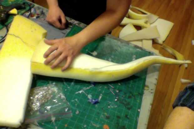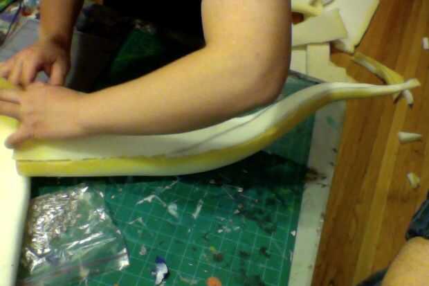 1) dibujar y recortar los dos hombros de la espuma para que los brazos pueden entrar en ella... Como poner una chaqueta al revés. (Foto 2)