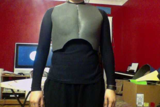 5) a partir de ahí, presiona el pecho y espalda pedazos en la persona de la espuma. La razón que ha agregado una pulgada extra para el ancho es para que puedan hacer la conexión RAS. Se superponen las aletas laterales del tórax sobre las aletas laterales de la pieza posterior. La marca de la espuma en exceso y les corte. (Foto 5)