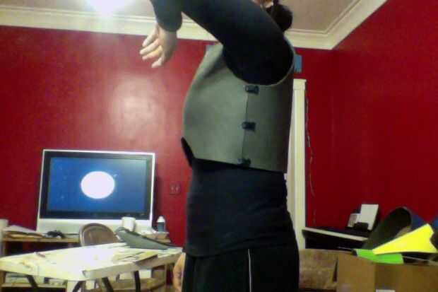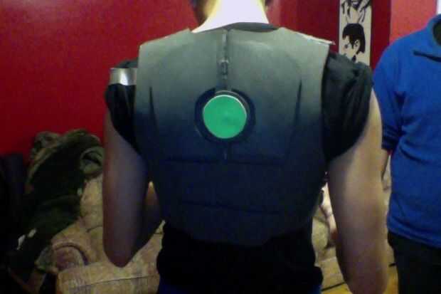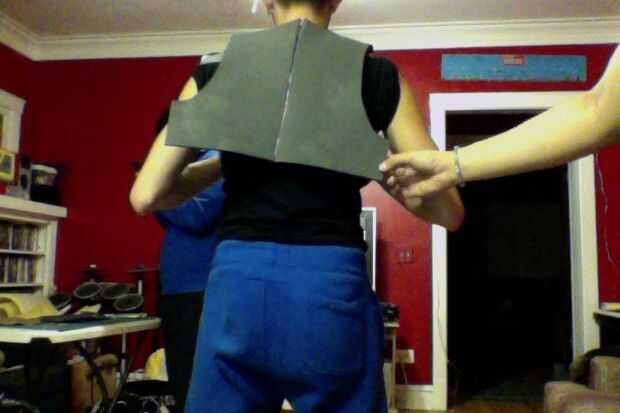 9) ahora más espuma y ponerlo en las secciones de hombro. Acaba de tomar algunos espuma extra, colocada en el espacio vacante donde la correa de hombro sería, márquelo y luego cortarlo. Pegamento en su lugar una vez terminado.