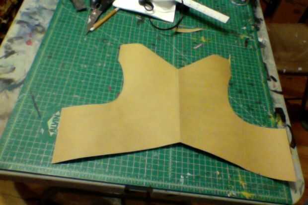 2) doblar por la mitad, dibujar en tu plantilla y luego empezar a cortar la forma general de papel doblado (Foto 1). Al desplegarlo, debe tener la pieza frontal (Foto 2) * esta fotos no es la placa del pecho real, pero el concepto es el mismo.
