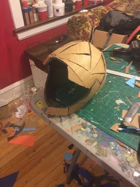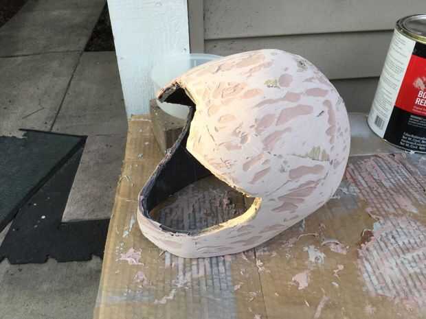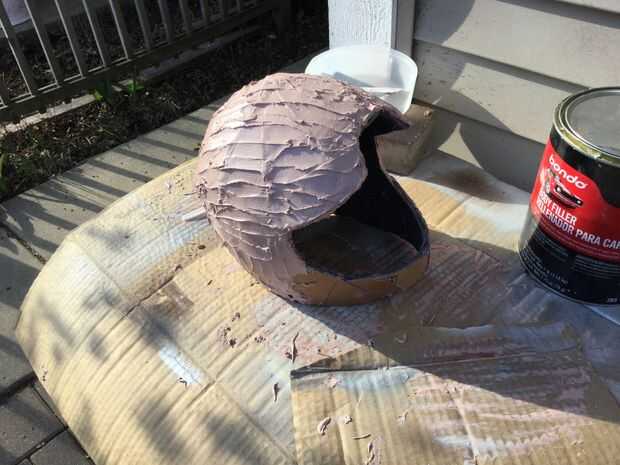 3). una vez terminado, comenzar bondo-ing el casco de cartón. sólo seguir añadiendo capas de bondo, lijado y repetir hasta que estés satisfecho. (foto 4, 5,6) 4) una vez que la base del casco, debería verse como un casco de motocicleta.