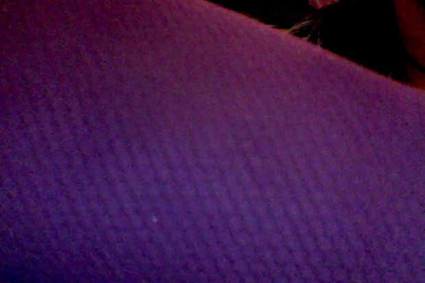 5) para obtener las mangas nuevas, agarré el par de medias púrpura del objetivo. Luego cortar la venda de la cintura y luego a la derecha por la mitad en la entrepierna. Usé las piernas de las medias como los brazos y la cintura como parte del cuello de la tortuga.