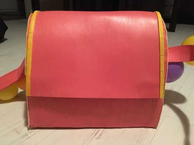 8) cortar una correa larga de la espuma de EVA para ser la correa del bolso. Pegamento en lugar de los lados. Realmente corte una muesca en el lado de la bolsa de para tener un mejor agarre cuando pegué en.