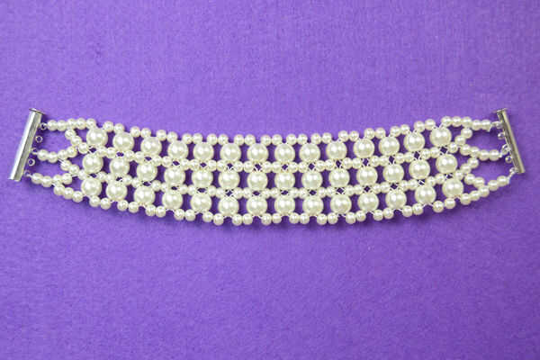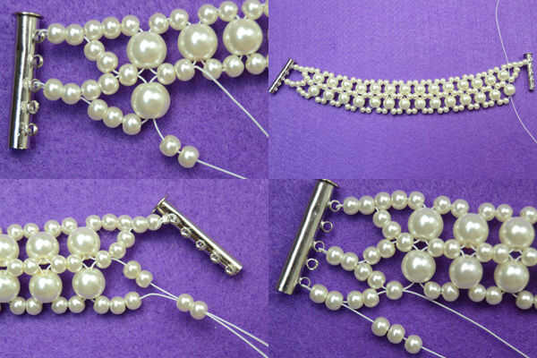 hilo de rosca 2, el cable superior a 2 granos como la parte superior izquierda esquina demostraciones del cuadro, añadir dos bolas de 4mm para bajar cable, cruza ambos extremos a través de un cordón de 8mm, repetir hasta que utilizar hasta catorce granos de 8mm; luego hilo de rosca de la parte superior a una tira de alambre como muestra la imagen inferior izquierda y añadir dos 4 m m, granos diapositiva tres 4mm para bajar el alambre, dos perlas de 4mm a ambos extremos y fijar el tigre de la cola al tercer anillo de la hebilla de bloqueo deslizante con el grano de la encrespadura, la segunda capa de la pulsera de la boda se realiza, lo mismo para hacer la tercera capa de la pulsera de la perla de la boda.