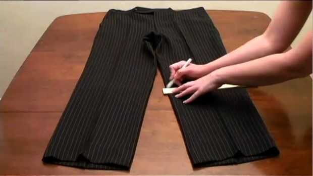 2. Coloque los pantalones plano y trazar una línea recta con tiza y una regla.