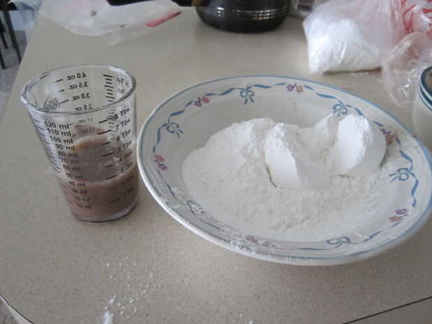 Después de mezclar con el azúcar, se hace la parte de relleno. Ahora vamos a trabajar en la parte exterior. Sacar harina de arroz 200ml y 80ml de agua con que se cocinan los frijoles. Esto le permite ahorrar el agua y tiñen las bolas de arroz con un precioso color rojo claro.