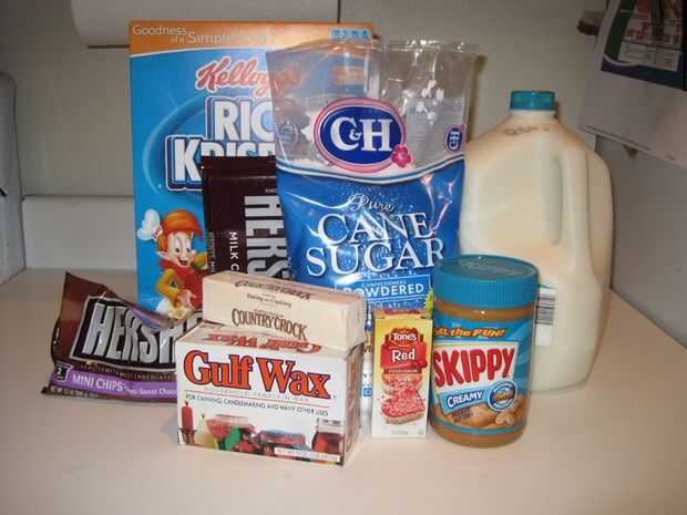 • 3 tazas de Rice Krispies • 2 tazas de cacahuate • 1 lb en polvo azúcar • 1 margarina • 1 barra grande de Hersey (8oz) • Virutas de chocolate Hersey (6oz) • ½ cubo de parafina • Colorante rojo • La leche