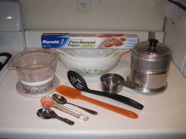 • 3 tazones (grande, mediano y pequeño) • Baño María, olla o recipiente grande para microondas • Medición de la taza y la escala • Espátula de goma • Cuchara ranurada • Cuchara • Medición de tazas • Cuchara para medir • Cucharada de galleta o las manos • Papel de cera