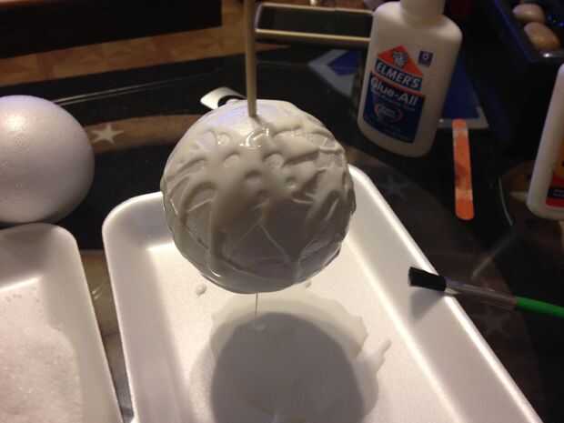 Hacer una capa uniforme de pegamento en la bola de espuma de poliestireno. Trató de separarse con un cepillo, pero terminó con mi dedo para llegar hasta la capa. Me pareció más fácil verter el pegamento en dejar el goteo exceso o recogiendo el pegamento y separarse con mi dedo.