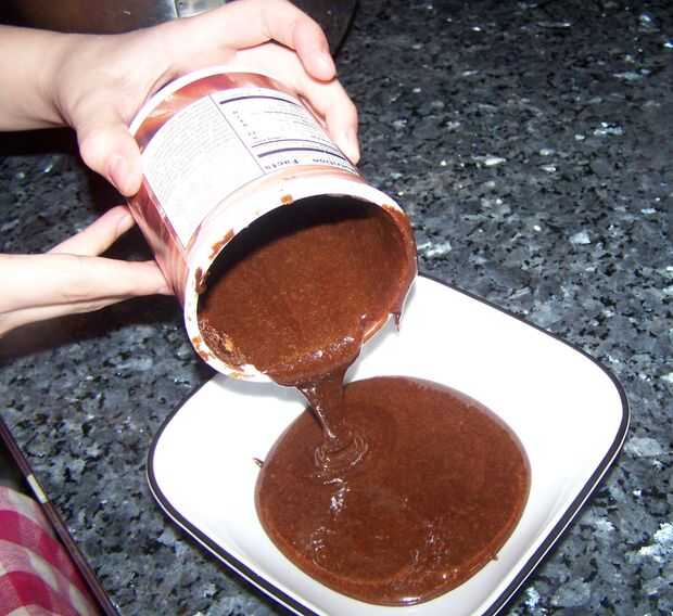 Convirtiendo literalmente el concepto de pies boca abajo! Para tomar su forma, este pastel en forma de una barra de chocolate se cuece al horno en 8 agujeros un poco profundas 12 hoyos cuadrados muffin/brownie (cada cuadrado 2-1/4 "x 2-1/4" x 1&
