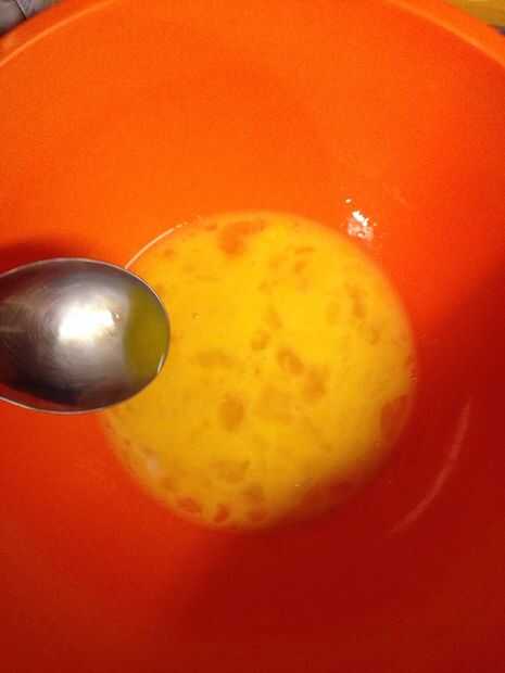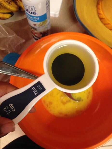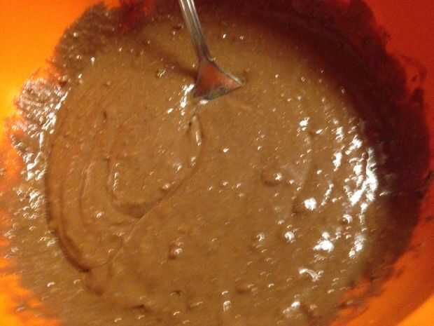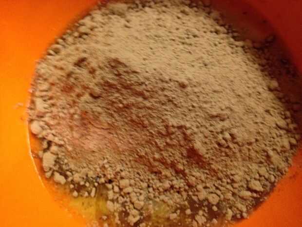 Me gustaría empezar por mezclar mis líquidos primero, luego agregar la harina pasado. Mezcla tus 3 huevos, aceite vegetal y agua junto en un tazón grande. A continuación, se agregue la harina de chocolate en el bol y mezclar con una cuchara.