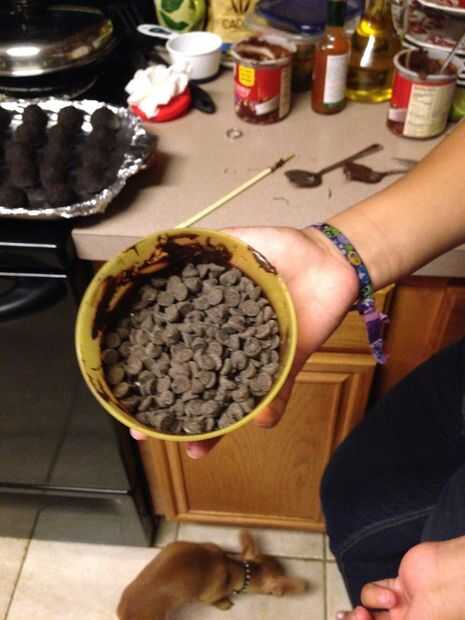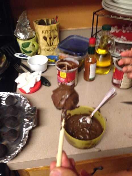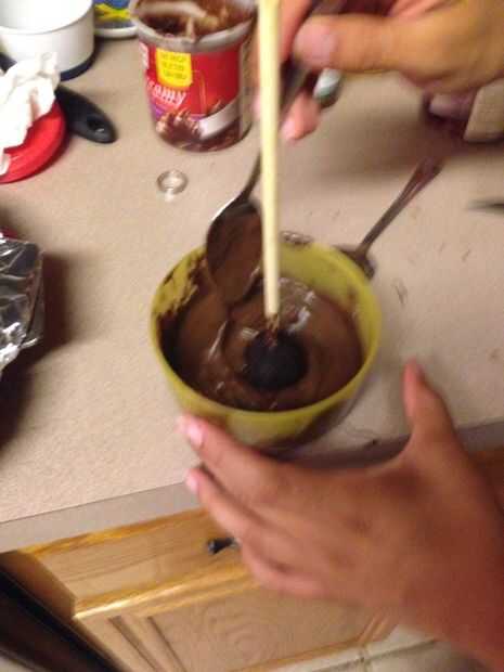 Después de que sus bolas se crean luego les cubra con chocolate derretido. Colocar trocitos de chocolate en un tazón pequeño y microondas por un minuto y 15 segundos. Después de revolver el chocolate derretido, coloque un palillo de dientes en una de las bolas y coloque en el recipiente para cubrir con chocolate. Una vez que la bola está cubierta Coloque en la misma bandeja o tabla que se enfríe. Repita para todas las bolas.