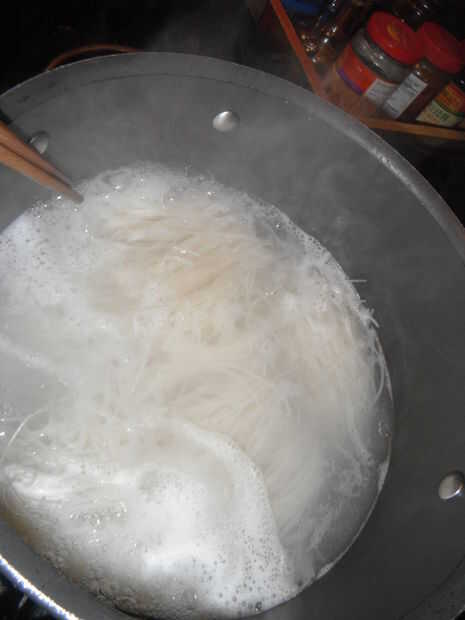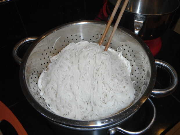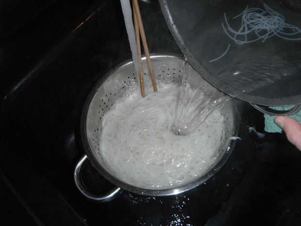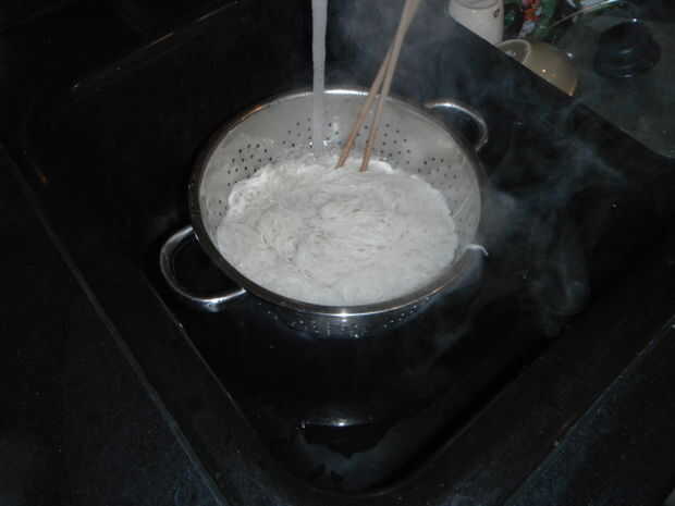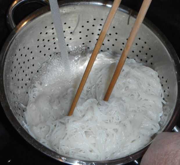 - Escurrir el pan y lavar suavemente, girando con los palillos mientras que agua fría - asegurándose de que están alcanzando la media y la parte inferior para detener completamente la cocina.