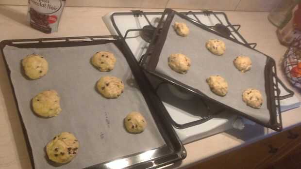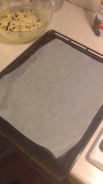 Ponga la hoja de papel de horno, y con las manos, formar unos bollos pequeños. Ponerlos en la placa. Aumentan de tamaño, así que algo de espacio entre ellos.
