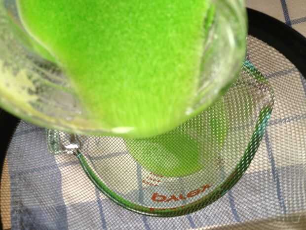 Después de dejarlo reposar el tiempo que quisiera, colamos en otro recipiente.  Será un buen color verde (o cualquier color belga le utilizado).  Este funciona muy bien para las bebidas que usted desea que un color determinado, pero no tiene el licor de color para que coincida con.  Va estar actualizando mi blog con una gran baba verde coctel muy pronto así que mantener un ojo hacia fuera. ;)