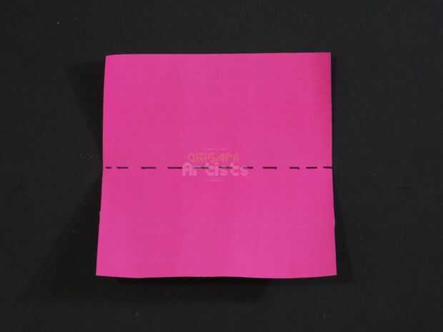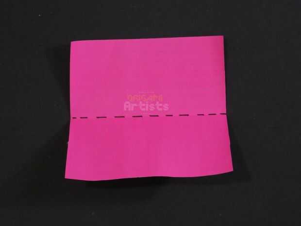 Empezar con un papel de origami (una hoja cuadrada). Color de lado debe. Hacer un valle doblar a lo largo de la línea discontinua, pliegue bien y desdoblar.