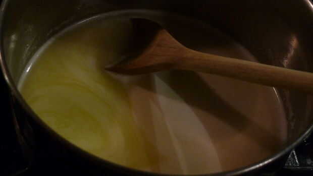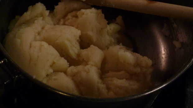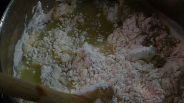 A continuación, añadiremos la harina a la mezcla en la cacerola. Yo sólo objeto de dumping en todos a la vez. Revuelva un poco, luego poner en el calor. Revuelve hasta que la mezcla no se pega a los lados de la pan(see picture). Tipo de parece plastilina en este punto. Tome la mezcla del fuego y dejar enfriar antes de pasar al siguiente paso. Poner en un cuenco diferente y agitación puede ayudar a enfriar más rápido.