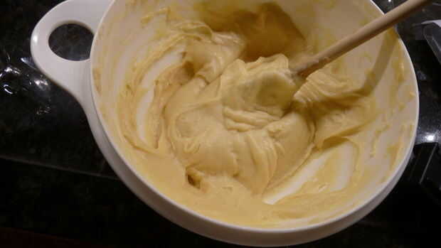 Por último, vas a añadir el huevo. Mezclar los huevos uno a la vez hasta que la consistencia es como masa de torta gruesa (se desprenderá la cuchara después de un segundo o dos). No flipar que si el huevo no se ve como se va a mezclar al principio, lo hará. El video muestra cómo desastroso puede ver al principio.