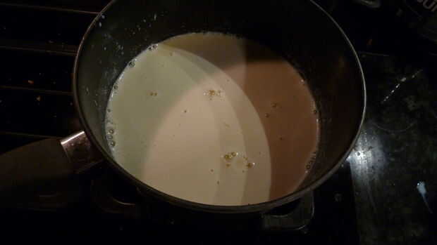 Calentar la leche en la estufa a fuego medio hasta que esté caliente. Luego, mezcle un poco de la leche en un momento en la mezcla de huevo; no quiero cocinar los huevos aún. Seguir añadiendo leche a la mezcla de huevo hasta que la mezcla esté caliente. Luego, agregar la mezcla en la olla con el resto de la leche. Regresar la olla a la estufa. Cocinar los pasteles de crema en la estufa hasta que espese y empiece a burbujear.
