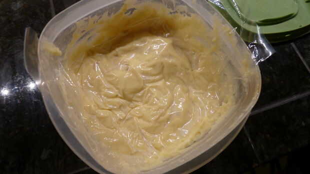 Verter la crema pastelera en un recipiente y cubra con envoltura de plástico (la envoltura de plástico es para evitar una "piel" de la formación de la crema pastelera). Refrigere la crema hasta que se enfríe.