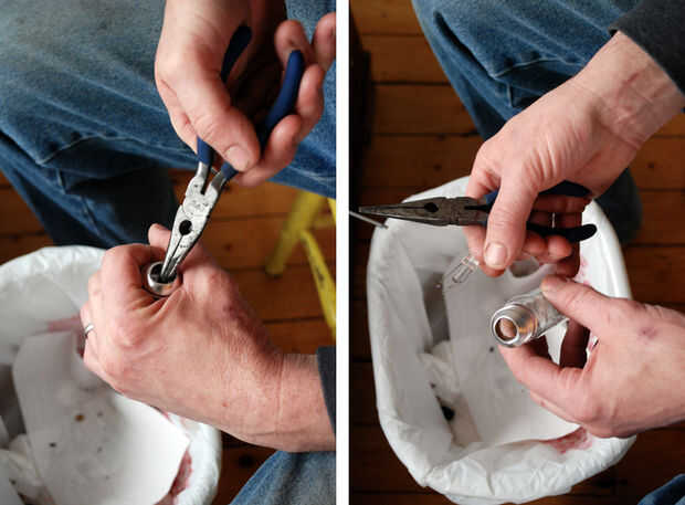Quitar las "entrañas" de la bombilla con sus alicates de punta. Sacudir cualquier cristal suelto. Ahora tienes un florero.