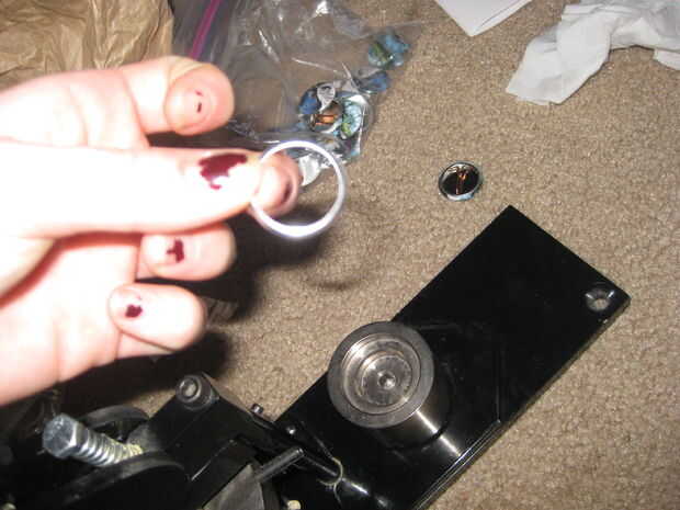 5. después de pulsar el botón se levantará en la parte superior de la prensa del botón donde permanecerá hasta que ha asegurado todas las piezas juntas. Para ello nos gire el soporte y lugar en el círculo de metal en ella boca arriba.