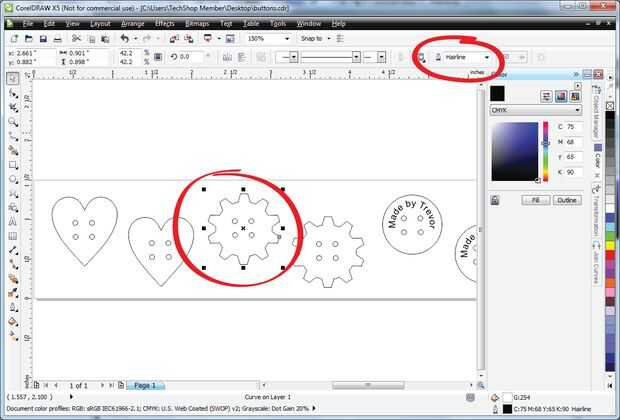 He utilizado CorelDraw para diseñar mis botones. Empezar por crear un documento con el mismo tamaño que la pieza de trabajo.