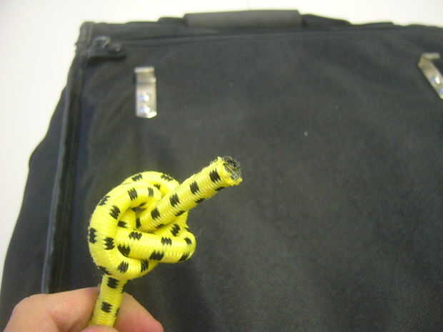 Una vez tuve mi vestido, había anuda el extremo con un nudo simple. El extra poco de bungee estaba atado con un nudo as de guía. ¿Por qué nudos? Porque los nudos se ajustan fácilmente ;)