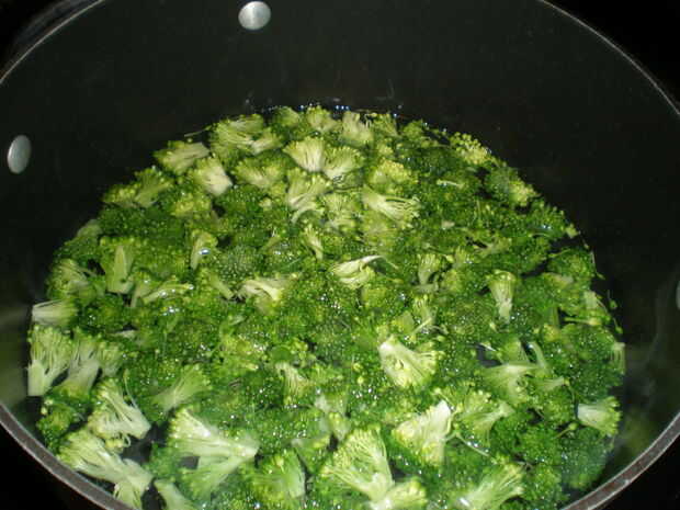Mientras tanto, cortar el brócoli 1/4-pulgada en pedazos de 1/2 pulgada. (Ver la foto para más detalles sobre el tamaño). Después ha cortado hasta las coronas de brócoli, al vapor les. Tenga cuidado de no para hacerlos demasiado grandes, o va a ser difícil trabajar con más adelante.