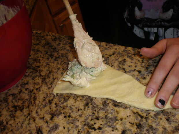Después de que hayas hecho esto, abra los rollos de media luna.  Una endecha plana y cuchara 1/3 taza de brócoli y el pollo de la mezcla hasta el gran final.