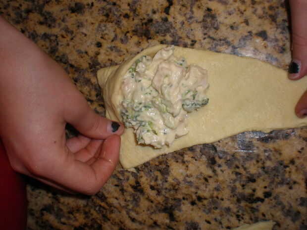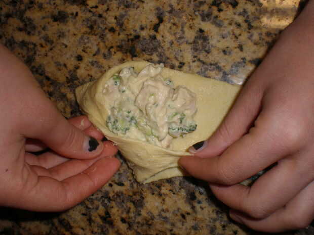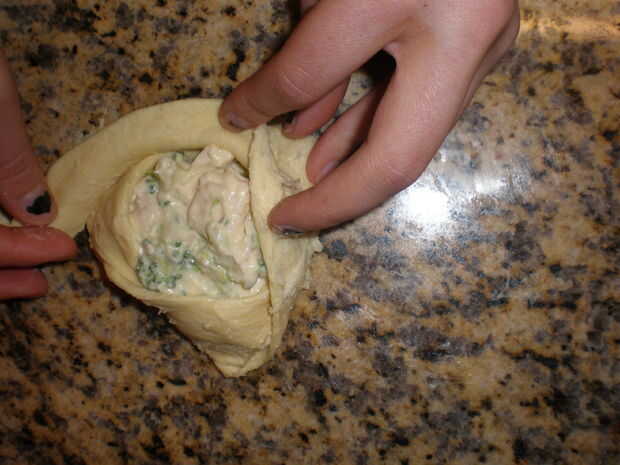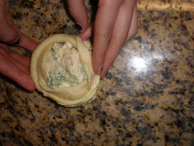 3) luego tomar la esquina larga (el extremo pequeño) y llevar todo el camino alrededor de la masa de la mezcla, envolviéndolo. (Ver fotos para más detalle).