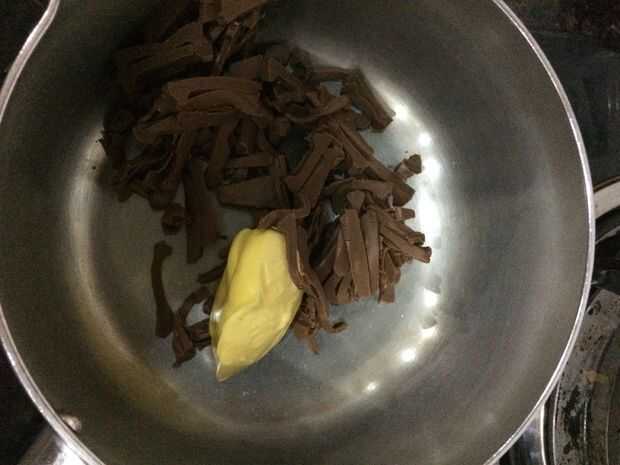 Fundir el chocolate con la mantequilla hasta que diluye.
