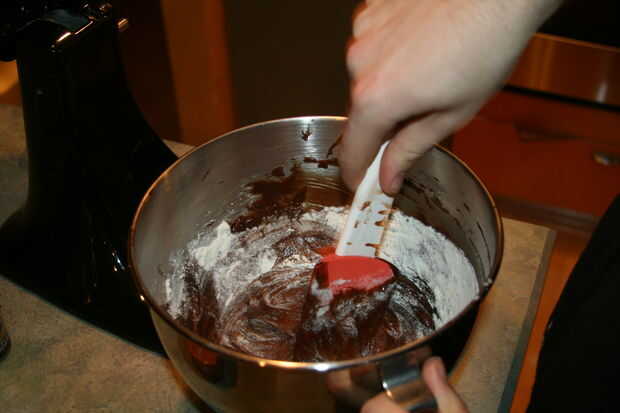 Con una espátula de goma, doblar la harina a la mezcla a mano. Tenga cuidado de no mezclar demasiado la masa, ya que puede causar sus brownies al ser más denso y menos esponjoso.