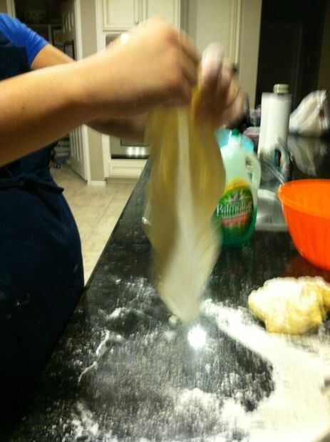 Una vez que las hojas se enrollan hold ellos y ayuda de la gravedad que estira la masa un poco más.