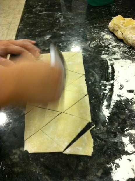 Corte diagonalmente de derecha a izquierda, entonces otra vez de izquierda a derecha, luego una o dos veces a través de la masa para hacer triangular en forma de virutas.